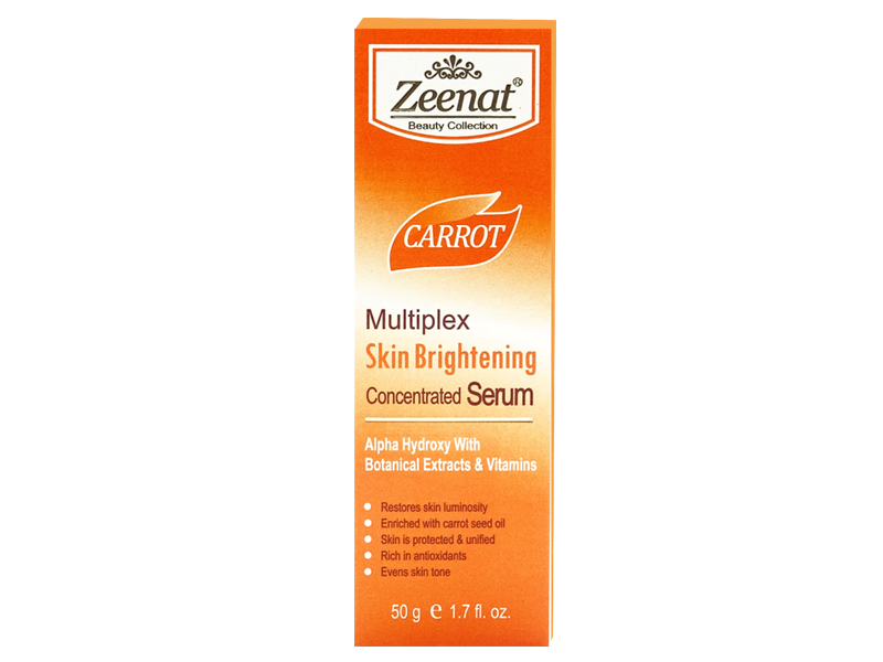 Zeenat Carrot Multiplex skin brightening serum is an advanced blend of tone enhancing plant extracts, vitamins and peptides complex. It fades unwanted discoloration and removes dark spots or age spots caused by sun damage, aging skin or scarring.
